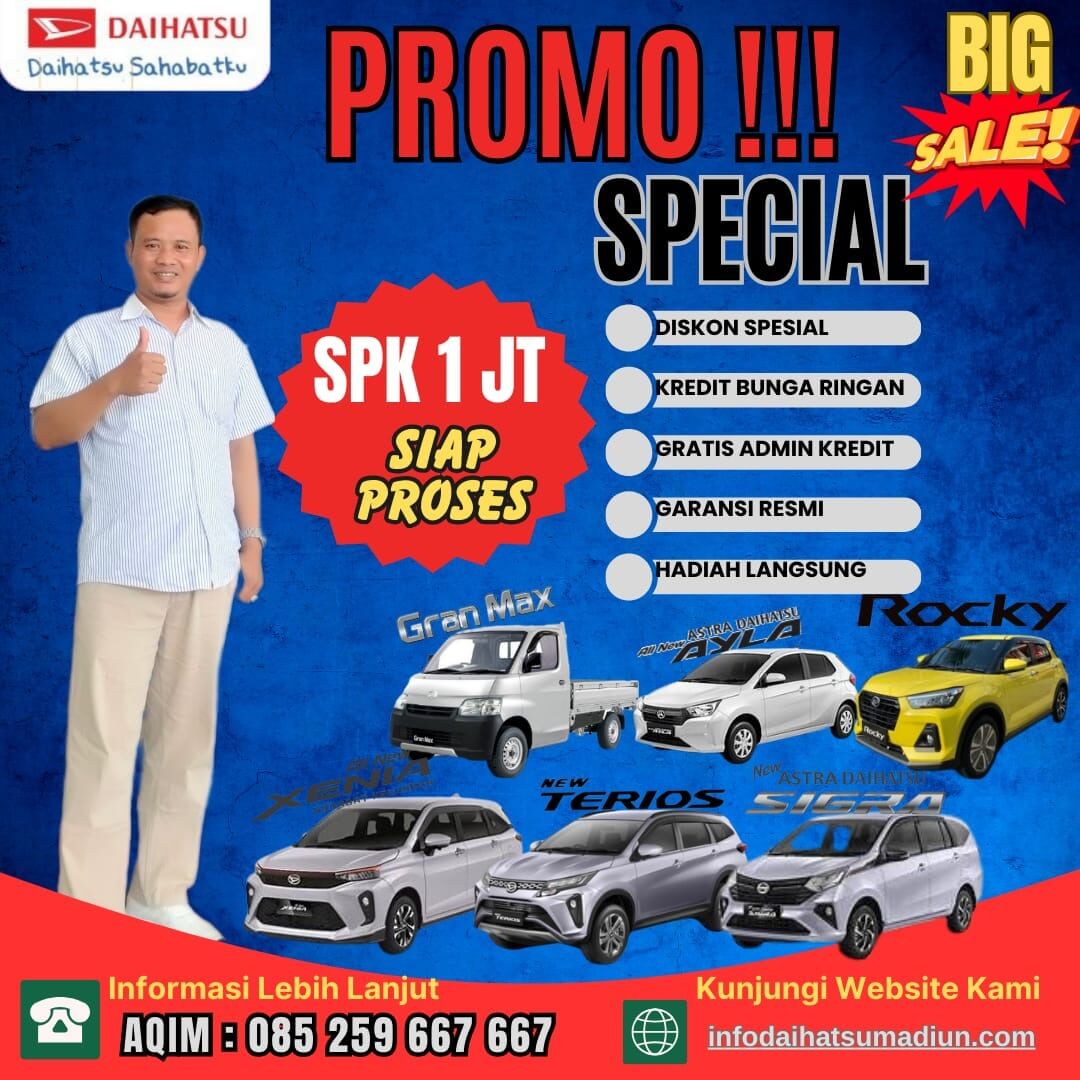DEALER MOBIL DAIHATSU MADIUN – Layanan Penjualan Kendaraan Daihatsu Secara Tunai Atau Kredit Untuk Pemasaran Mobil Daihatsu Wilayah Madiun, Magetan, Ngawi, Ponorogo, Pacitan Dan Daerah Sekitarnya. Dapatkan Info Terbaru Daihatsu Madiun, Promo / Event Daihatsu Madiun Terbaru, Info Harga OTR Daihatsu Madiun Terbaik, Syarat Kredit Dan Konsultasi Pembelian Mobil Baru Daihatsu Madiun. Saatnya Beli Mobil Baru Daihatsu atau Ganti yang Lama, Diskon Puluhan Juta, Kredit DP Murah, Cicilan Ringan, Pembelian Hubungi Sales Daihatsu Madiun AQIM DAIHATSU Telepon 0852-5966-7667 / WA 0852-5966-7667 Dealer Resmi Daihatsu Madiun.